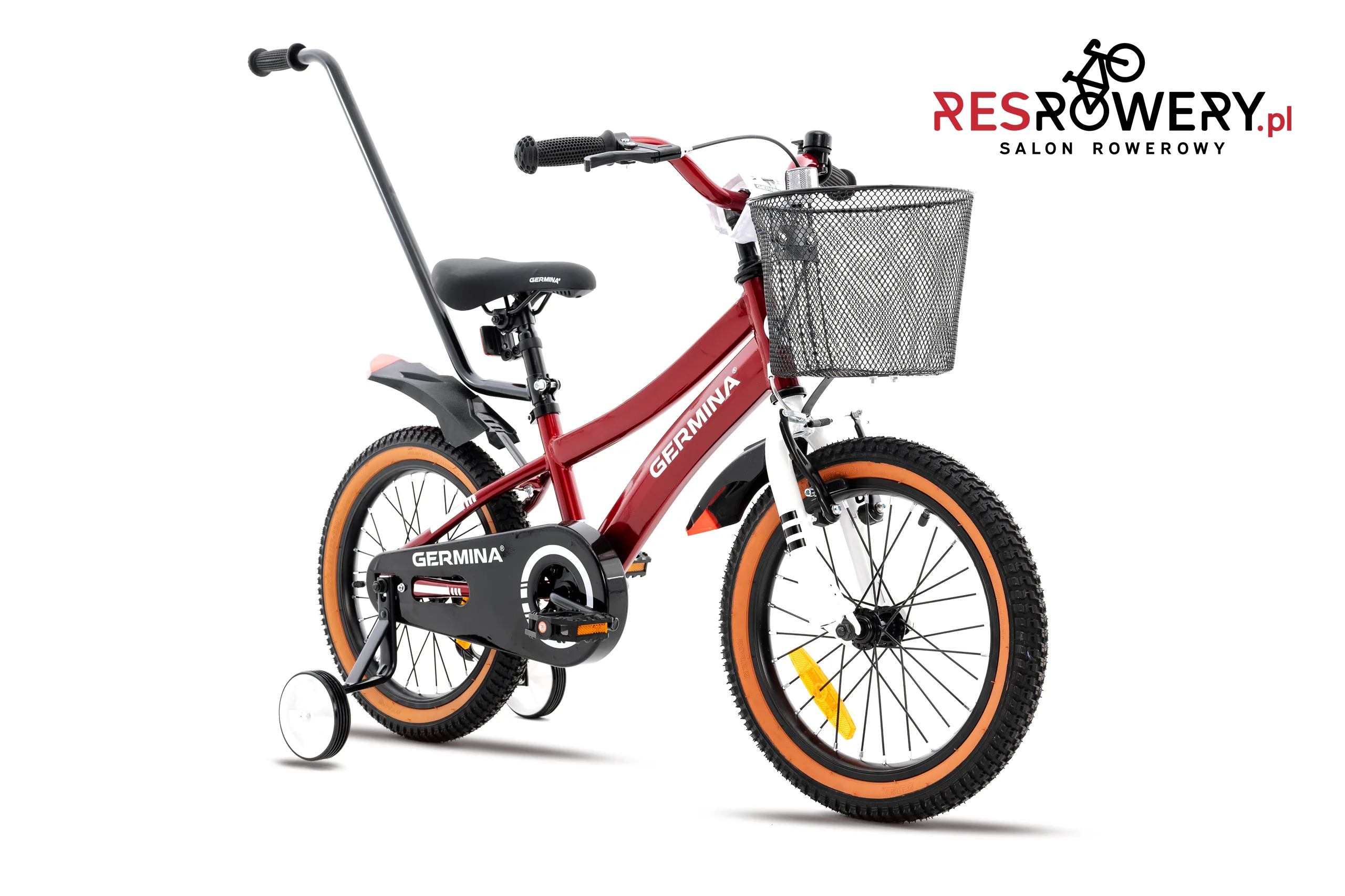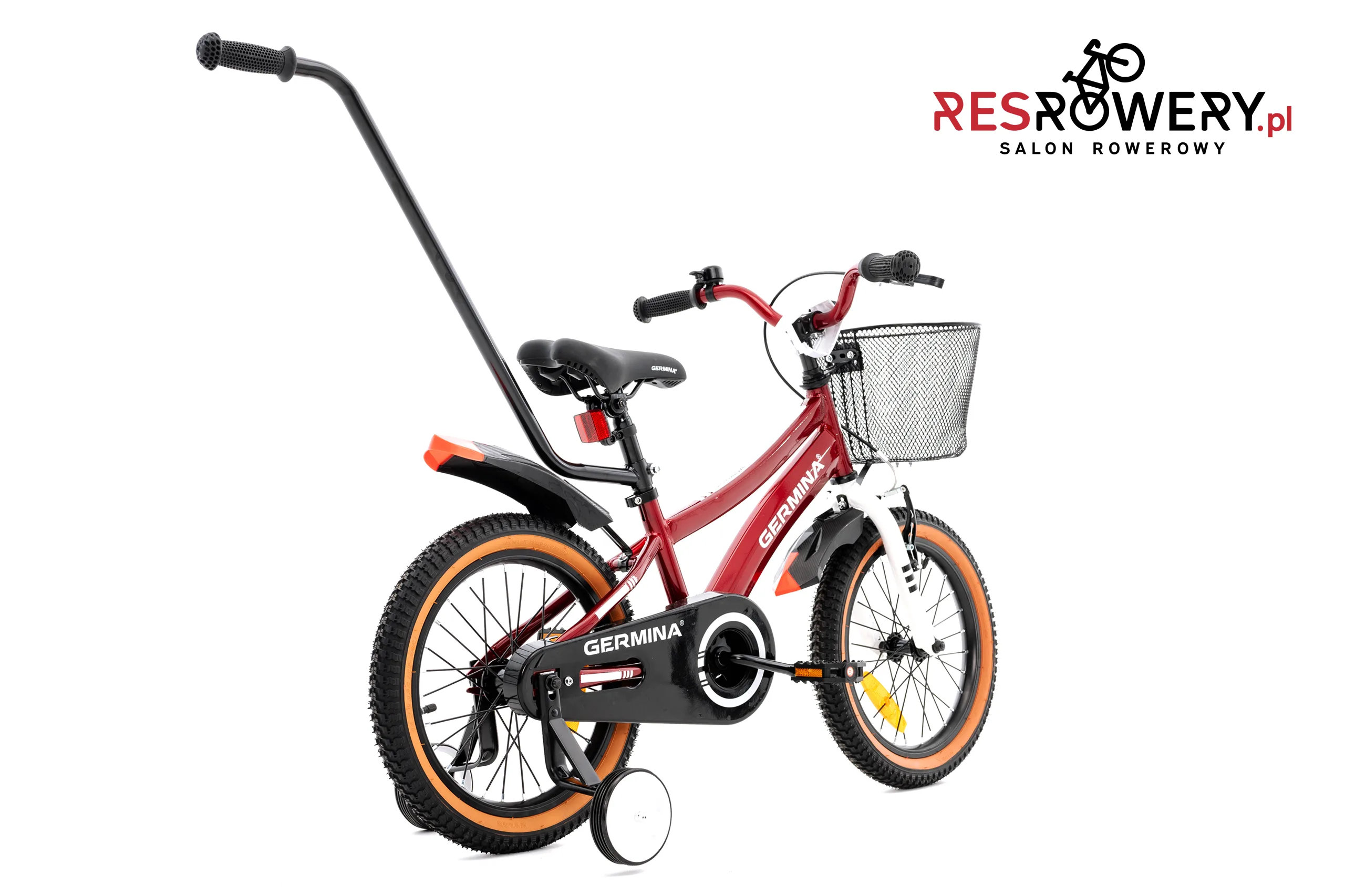 - Wyposażenie: Błotniki, dzwonek, koszyk, odblaski, kółka boczne, prowadnik